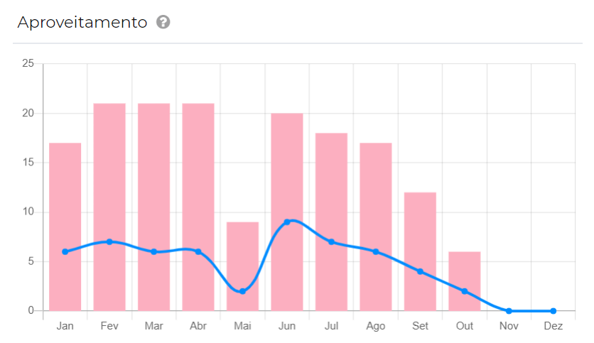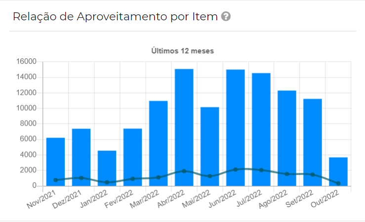 Apresentamos a quantidade de itens disputados por mês (barras) em relação ao total de itens vencidos (linha).