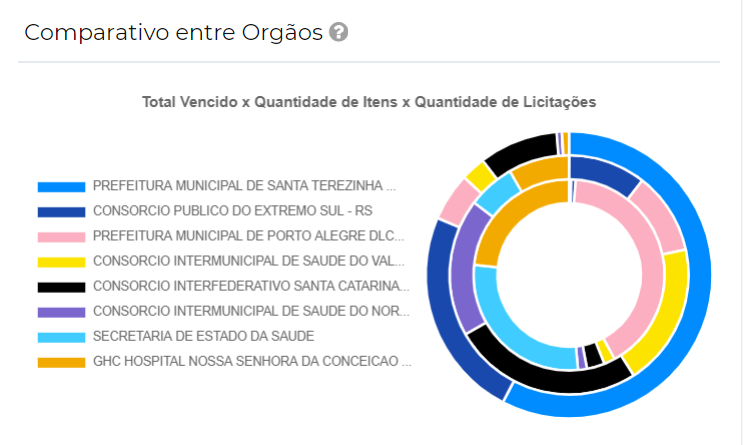 O gráfico apresenta três informações complementares: o valor total vencido, a relação de órgãos com quantidade de itens e a quantidade de licitações. Apresentamos os três órgãos mais relevantes de cada categoria e unimos seus dados – possibilitando a comparação.