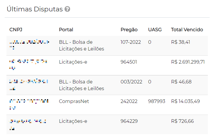 Mostramos as últimas licitações disputadas através da Etapa Disputar, contendo informações como: CNPJ da empresa que disputou, dados do pregão e o total vencido.